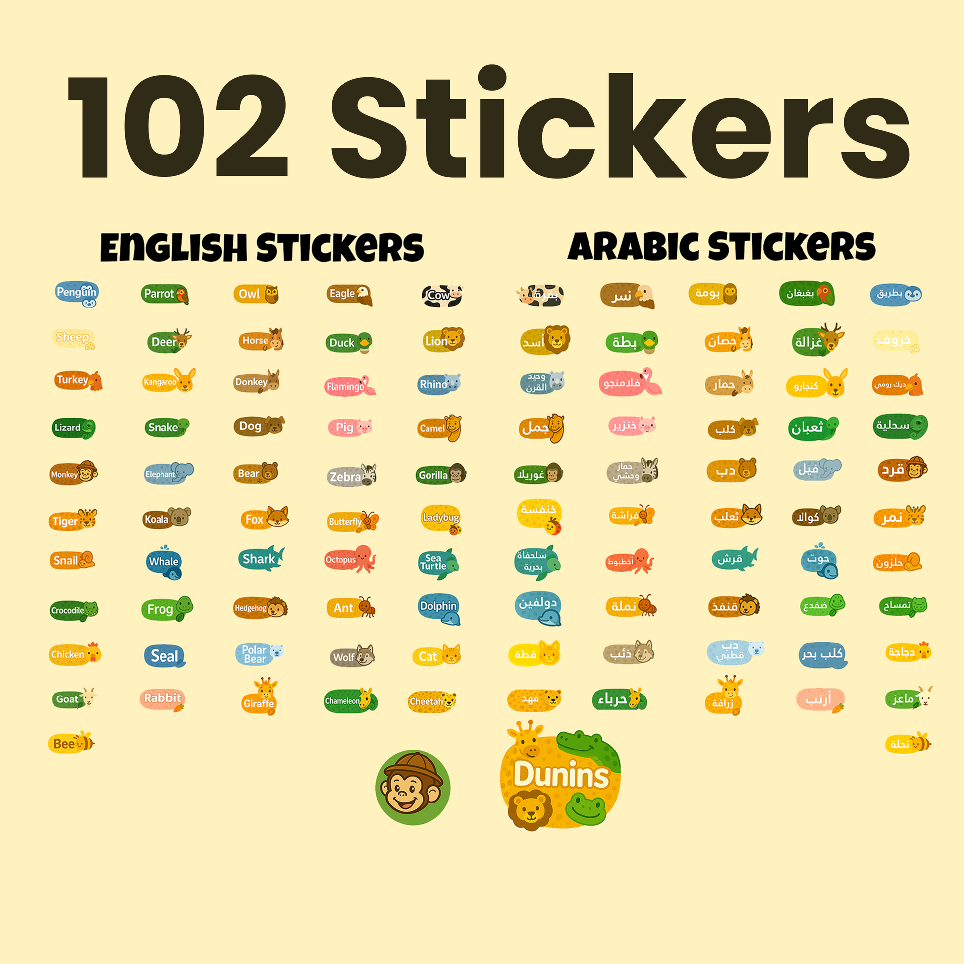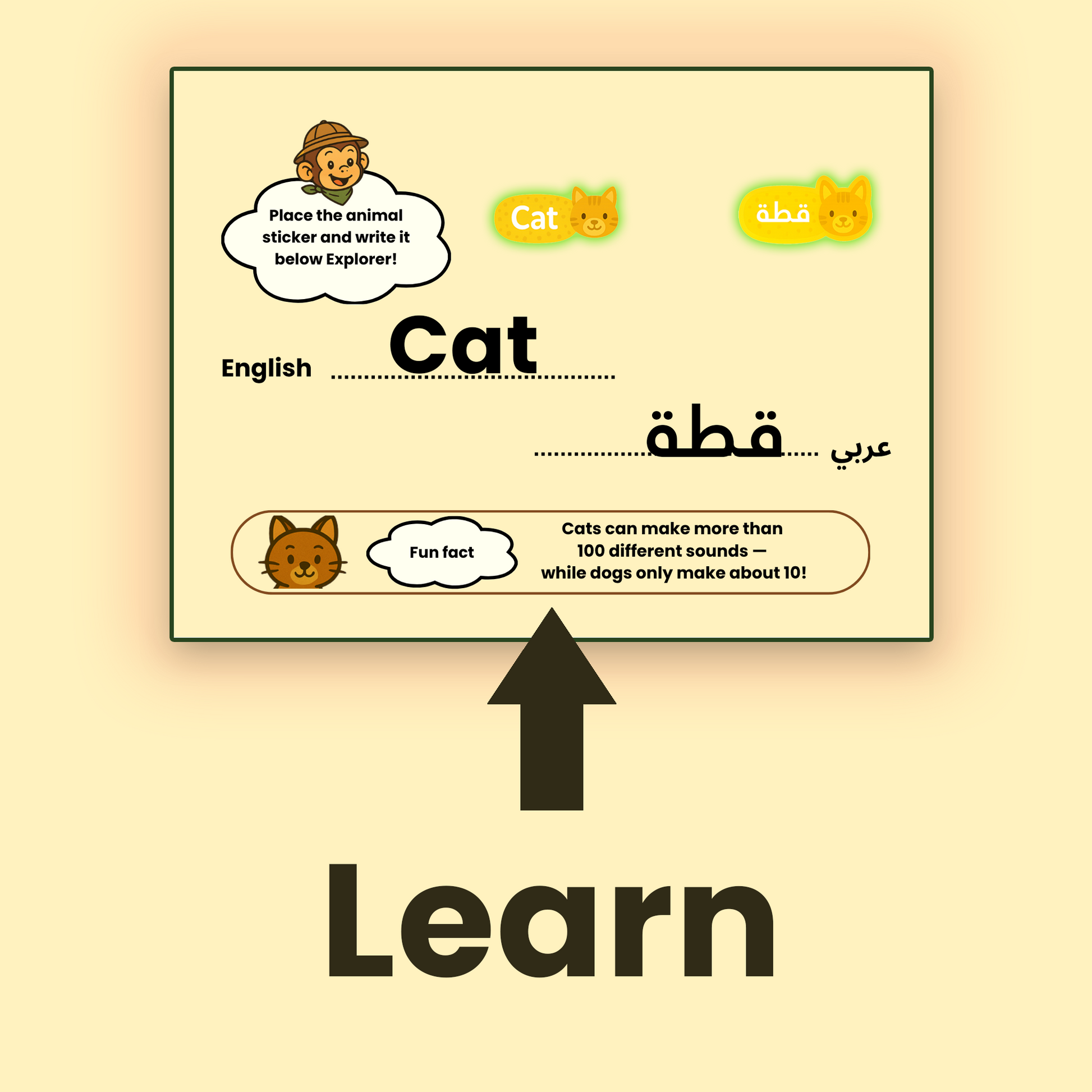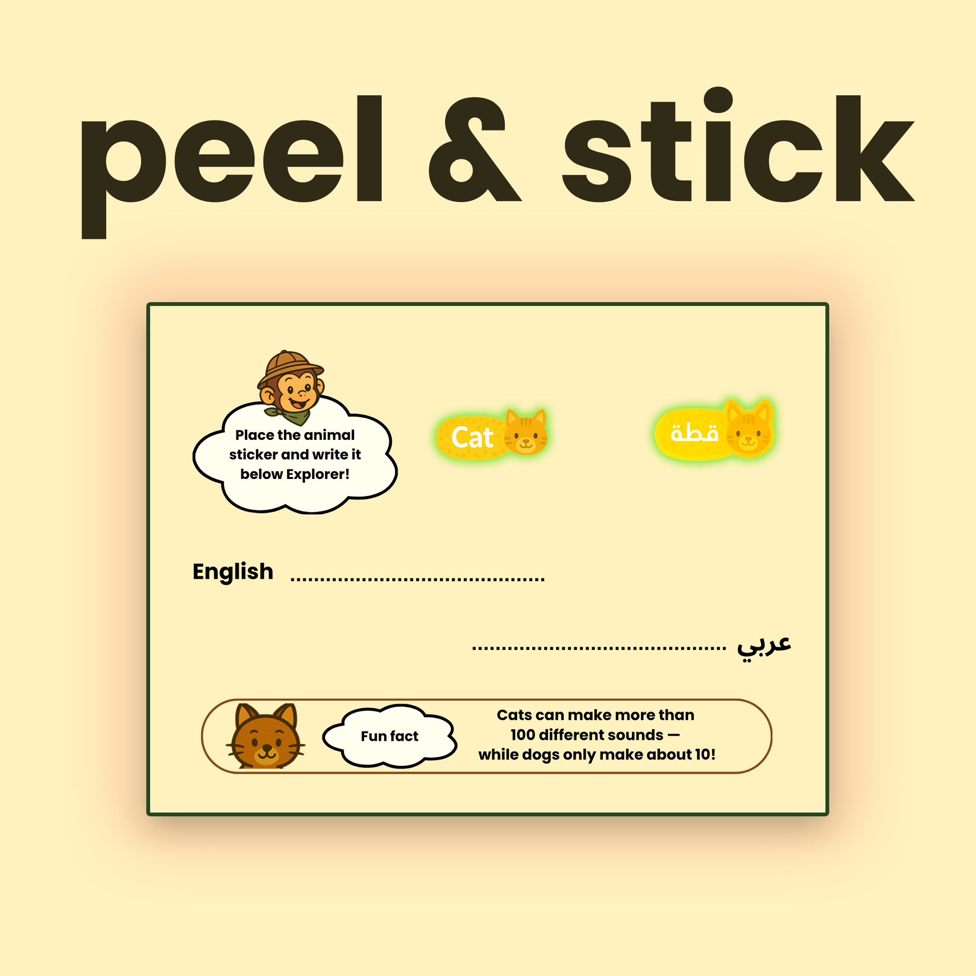 🐾 2 Sticker Packs – one in Arabic and one in English. Your child removes the sticker and pastes it onto the matching card.