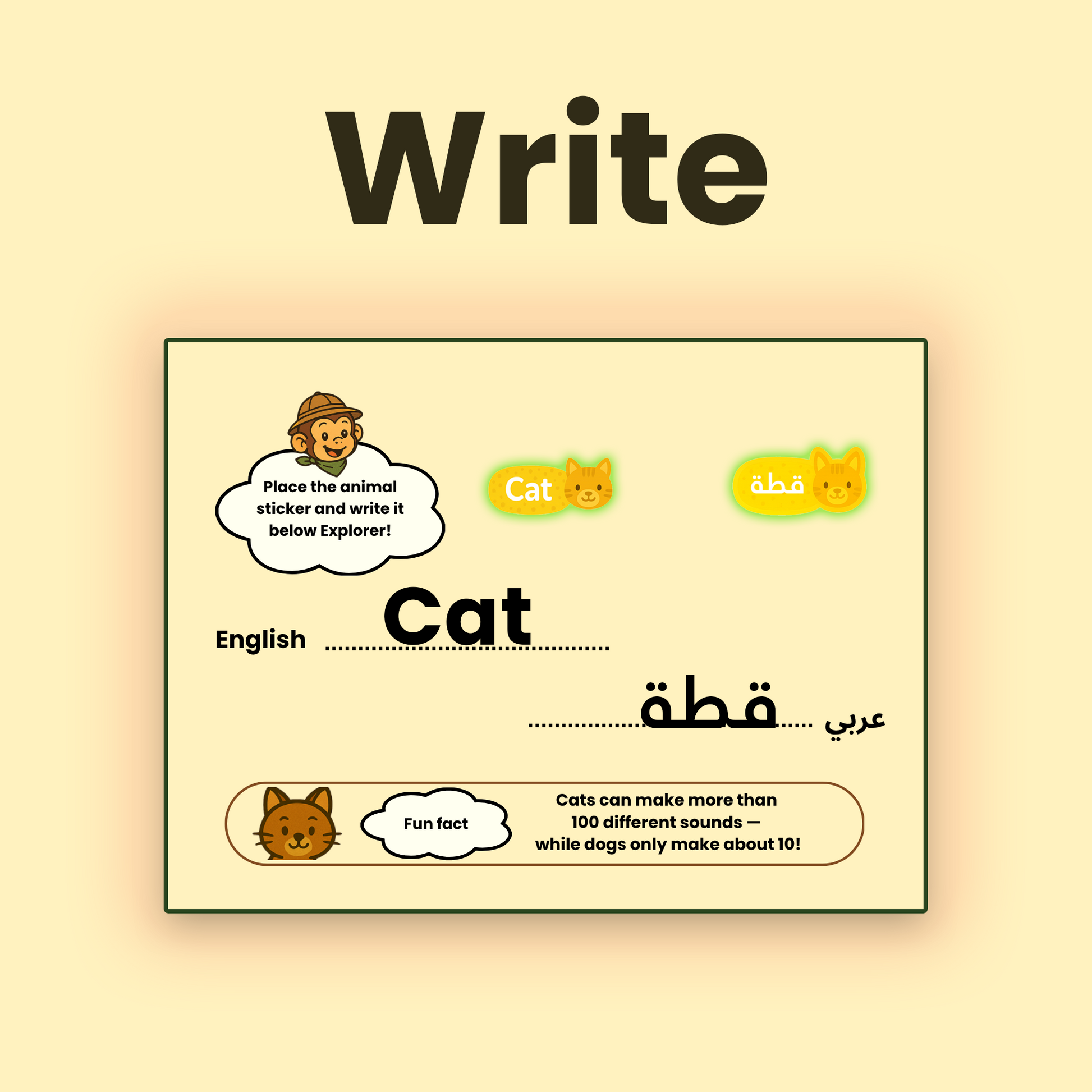 ✍️ Tracing Section – under the sticker, kids practice writing the animal’s name in both Arabic and English.